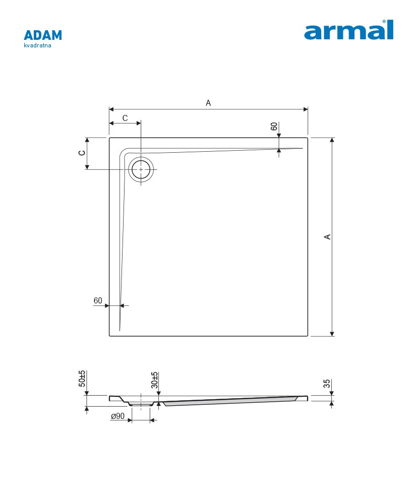 ADAM14 kvadratna bez postave 90 x 90 x 3,5 cm
